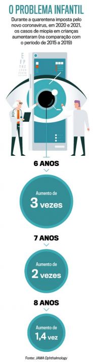 A miopia foi o problema de saúde de maior impacto entre as crianças ao longo do último ano, em decorrência da pandemia. O alerta veio de um novo estudo publicado na revista JAMA Ophthalmology, a maior referência científica na área. A conclusão: a prevalência da doença aumentou até três vezes em meninas e meninos de 6 a 8 anos em 2020, em comparação ao período de 2015 a 2019. Dois hábitos extremamente nocivos aos olhos, típicos da vida moderna, foram agravados com o confinamento doméstico — a exposição insuficiente à luz natural, sem horizonte à vista, e a leitura de perto, de muito perto, resultado do uso exagerado de smartphones, tablets e computadores.